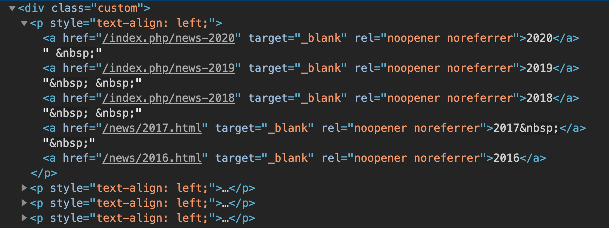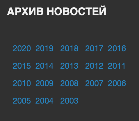 Во второй колонке расположен блок с ссылками на архив новостей. В стиле этого сайта было бы сделать ссылку на архив в виде файла, но вместо этого здесь ссылки на большие HTML страницы со всеми новостями за год. Ссылки в любом случае неправильные, об этом поговорим в пункте 19.